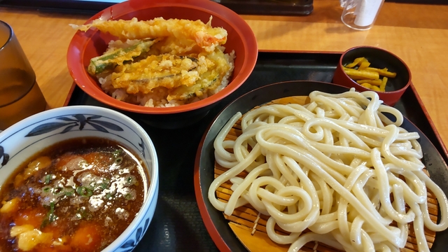 週末のお昼13時過ぎに2人で伺いました。 店内は広くて席数があるので、待たずに着座できました。テーブルと座敷がありました。 注文はタブレットからできて、食後のデザートを持ってきてもらう声掛けもタブレットでできます。 冷やし鶏みぞれ満腹定食の並(1020円)とコーヒーゼリーを注文。 冷やし鶏みぞれうどんは、麺は武蔵野うどんとのことで、軟らか目で注文したので冷たいつけ汁でも腰がありすぎずにいただけました。つけ汁は小さめの鶏がほどよい量で入り、みぞれとネギ、冷やした汁で暑い夏でもさっぱりとしておいしいです。 天丼は海老、イカ、なす、カボチャ、おくらが載っていて、油っこすぎず量的にも丁度よく最後までスムーズにいただけました。 機会があれば、次回は肉汁のつけ汁うどんにしてみたいと思います。