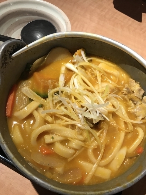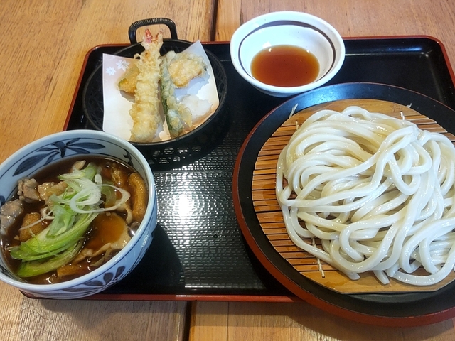 こちらうどん・天ぷら・しゃぶしゃぶのファミレス的チェーン店ですが、夕食のため初訪問しました。うどんを中心として、メニュー豊富なので選択に迷いますが、季節限定メニューがあったので、その中の「わさびとろろ天ざるうどん」を試すことに。うどんの量目は小盛~並盛~大盛~特盛~メガ盛の5段階表示なので、これまた迷いますが、とりあえず大盛で注文。わさびとろろに使用の長芋は国産と謳ってます。到来した平盆にざるうどん(太麺)、天ぷら盛合せ(エビ/イカ/カボチャ/ナス/オクラ/レンコン)、わさびとろろ、うどんつゆ(利尻昆布や5種の魚の出汁使用とか)、薬味(おろし生姜/刻みネギ/刻み油揚げ)が載っています。早速薬味をつゆに散らし、わさびとろろを加えてうどんを食すと、つるっとして結構コシのある食感。わさびの香りと辛味が食欲を掻き立てます。つゆ自体が意外に塩辛くないのも良いです。天ぷらは揚げたて間もないのか結構温かく、衣はサクサクの食感。具の種類の多い点が良いです。うどんの量目は大盛で十分でした。