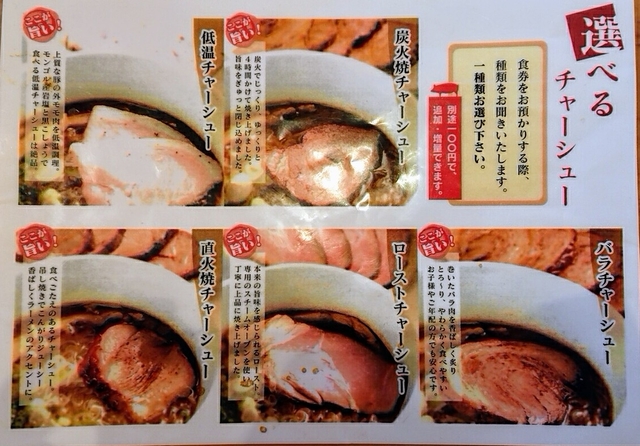 真空ラーメンは真空鍋という特殊な鍋でスープを作ったものだそうです。 チャーシューは、どのラーメンも5種類のチャーシューから選べます。