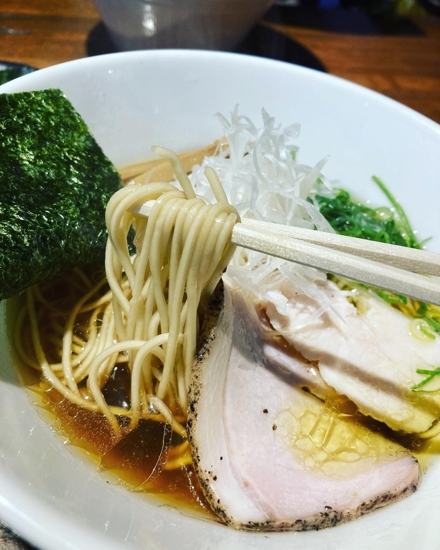 久しぶりに昼に訪れましたが、ほぼ満席で相変わらずの人気です。今回は期間限定のあご出汁を注文し、選べるチャーシューは香ばしく炙って柔らかく食べやすいというバラチャーシューを選択。具は約6-8mm厚のチャーシュー1枚、海苔1枚、メンマに刻みネギ。醤油ベースの清湯はあご出汁の旨味が強く、節系の香りも実に良いです。清湯表面には油膜もかなり浮き、とても美味でした。
