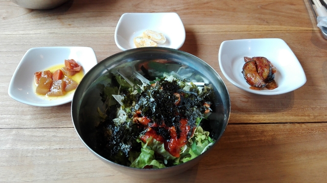 ランパラメニューのタッカルビ丼をいただきました。ピリ辛のコチュジャンが食欲をそそります。生野菜、韓国のり、タッカルビの相性も良く、混ぜまぜして、あっという間に食べきりました。 3種のおかずも良いですが、スープがあった方が、よりいっそう美味しくいただけたと思いました。