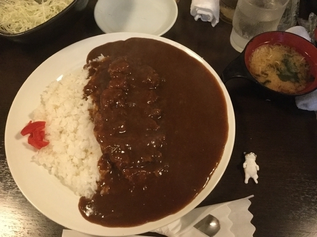 かつカレーが良いという口コミをどこかのフリーペーパーかで見かけ、昼に訪問してみました。カレーメニューは「かつカレーランチ」と「かつカレー丼」があり、前者が限定10食との注記が・・。ランチが注文可能かを訊いたら、まだ大丈夫とのことだったので、まずは「かつカレーランチ」を注文。盛りが小、普通、大、特大(かつ2枚とか)とあり、口コミには結構盛りがいいとあったことを思い出し、まずは普通としました。壁の貼紙を見ると、こちらのお店ではブランド豚の奥久慈ポークを使用しているようです。またメニュー以外のものも色々貼ってあり、お店を訪れたスポーツ選手のサイン入り色紙も何枚か飾ってありました。最初に千切りキャベツの皿が青じそ和風ドレ&胡麻ドレとともに到来し、次いで直径30cmに近い大きな平皿に盛られたかつカレーライスに、カップ入りの味噌汁(豆腐/ワカメ/ネギ)が配膳されました。普通盛りですが、載っているとんかつは差し渡し20cm近くと大きいし、カレーライスも結構多め(大以上にしなくて良かった)。とんかつは適度に脂身が入っていて実に美味しい。カレーはやや黒っぽく、入っている具はタマネギ程度ですが、こちらも適度な辛さと旨味が良いです。また昔ながらの赤い福神漬が添えられてました。キャベツはお替り可だったので、一杯だけお替りしましたが、これで十分満腹になりました。最後にお茶も出してもらえて良かったです。なおこのお店は今月12日に、某TVクイズ番組で紹介・放映される旨を宣伝してました。