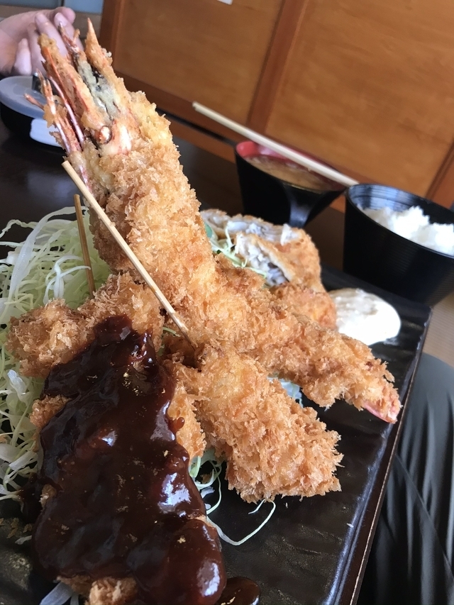 ランチのトンカツも美味しいが、エビフライもおすすめ。有頭の立派なエビで、食べ応えがあります。夜は飲み会にもおすすめ。