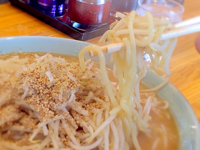 モヤシはシャキシャキ、太〜い麺がスープに絡んで激ウマです☆いくら食べても飽きが来ないラーメン♩さすが人気店!!!