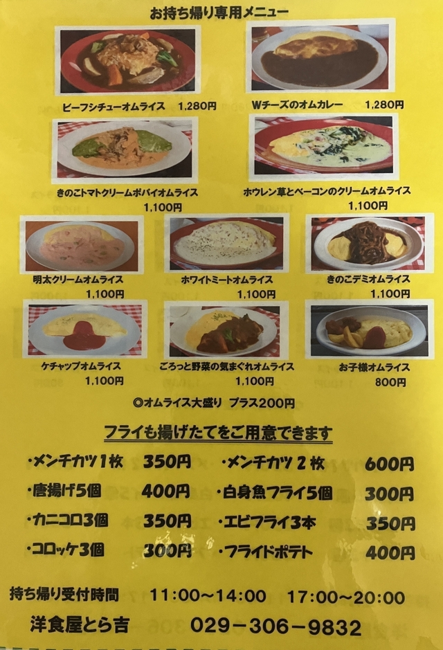いつもご来店ありがとうございます。ソースで食べるオムライスを中心に12種類取り揃えております。オムライスが食べたくなったら、とら吉に来てくださいね。ご来店お待ちしております。写真は人気メニューの「明太クリームオムライス」 店舗向かいに4台分駐車場を増やして、セブンイレブン側道奥と合わせて9台分になりました。