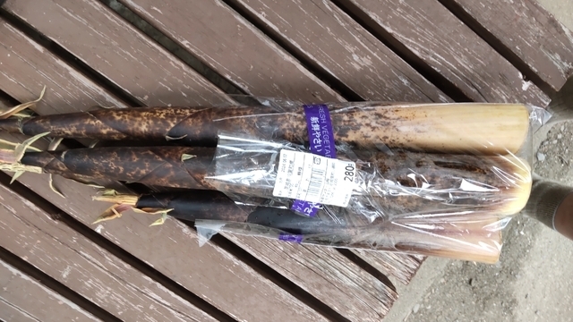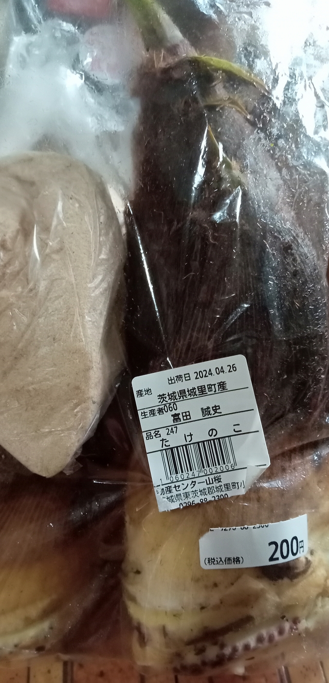掘りたて新鮮な「たけのこ」を納品している時に遭遇。値段のシールは200円で驚きました。レジスタッフの方が米ぬかを付けてくれました。たけのこご飯を作ろうと思います。
