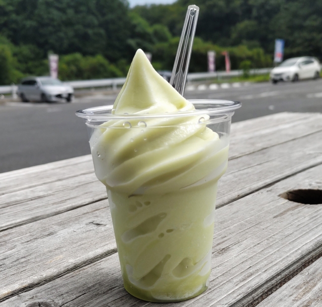 【シャインマスカットソフト】 ソフトクリームを販売していて、茶葉を使った「やぶきたソフト」が定番ですが、そのほかに「ミルク」と「シャインマスカット」がありました。今回はストレートのシャインマスカットをいただきました。(ミルクとのミックスもあります。) シャーベットに近い食感で、シャインマスカットの風味もしっかりとしていておいしくいただきました。 1つ400円ですが、JAFカードを提示すると350円になります。