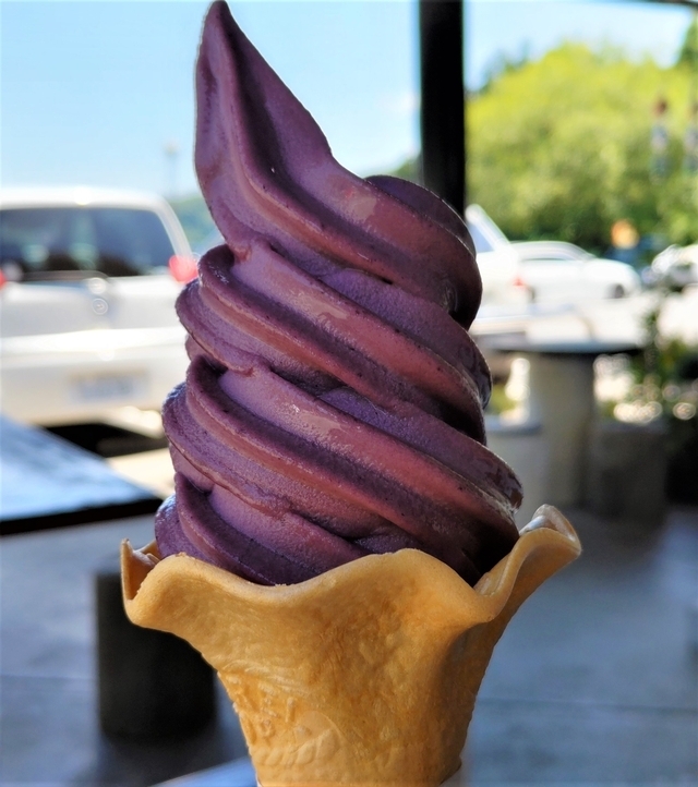 《ブルーベリーソフトクリーム》350円 やぶきた茶を使ったやぶきたソフトとブルーベリーソフトの2種類ありました。 今回はブルーベリーソフトをいただきました。 紫色した果汁たっぷりといった感じのソフトで、暑い中さっぱりといただきました。 ミルクとのミックスもあります。 JAF会員カードを提示すると50円引きになります。