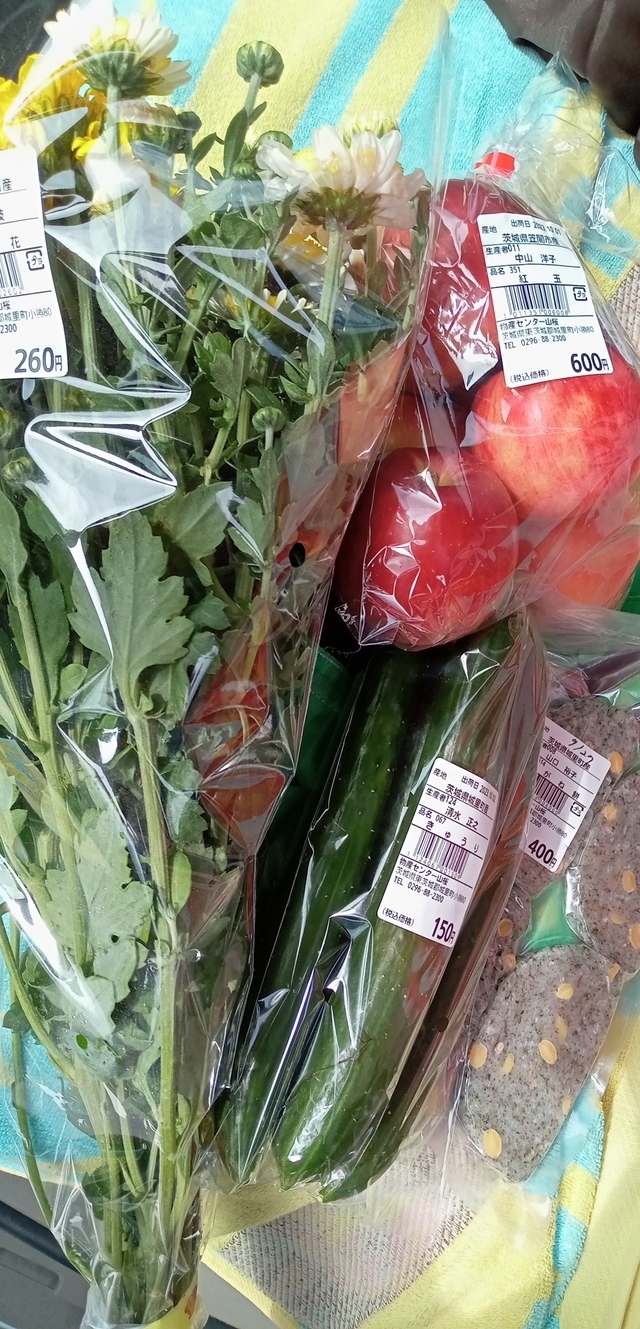 笠間市産「紅玉」城里町産「たがね餅・きゅうり・切り花」を購入しました。地元と近隣産の農産物・加工品が販売されていて、値段がお手頃価格だと思います。支払いは、現金のみで、ポイントカードもあります。