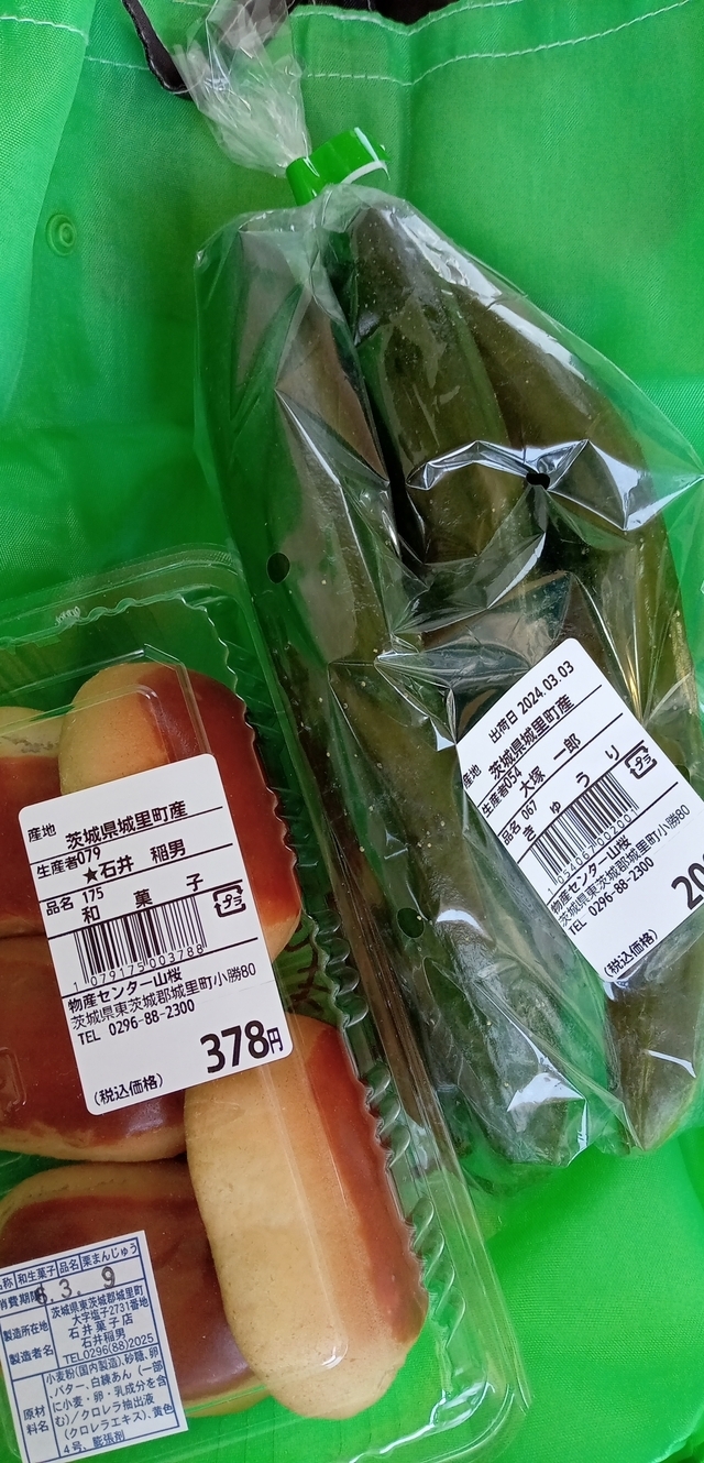 和菓子5個入り378円のリーズナブル価格。他の和菓子も気になります。お茶うけにとても喜ばれました。オススメです!!地元産の新鮮なきゅうりも購入しました。