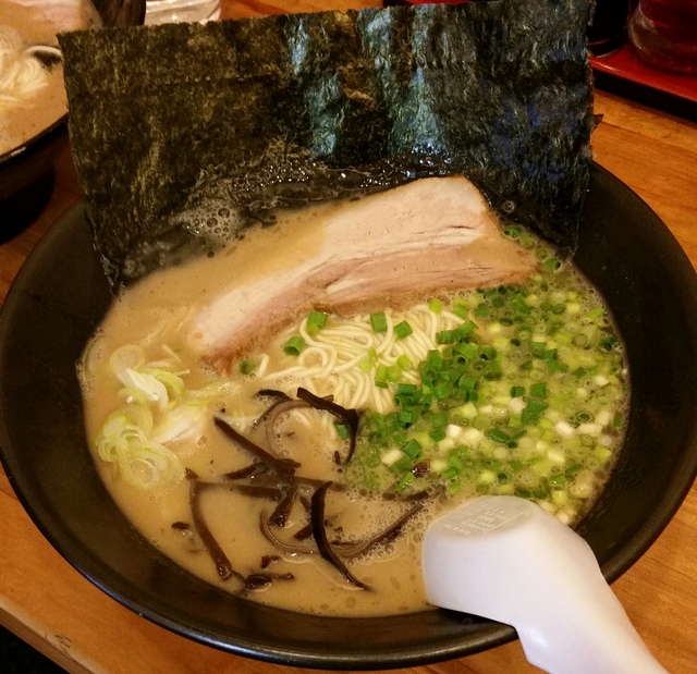始めて濃厚豚骨醤油ラーメンを食べました。博多とんこつは苦手な方だったんですが、濃厚なスープが細麺に良く絡み、お箸が進む!!生のニンニクが置いてあるので自分ですって入れる事ができます。