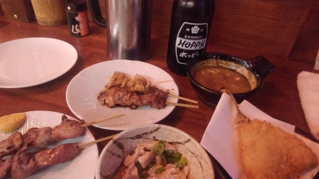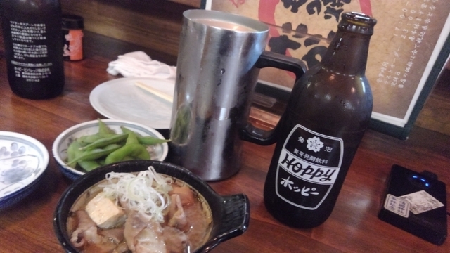 1500円のお一人様セットを注文。 ドリンクはホッピーセットを。 もつ煮、モツ焼き4本、ガツ刺し、アジフライ。 こんなに出てきて1500円は最高。 プラスでホッピー用の中を追加。 友達と合流する前の一軒目でしたが、良い時間でした。