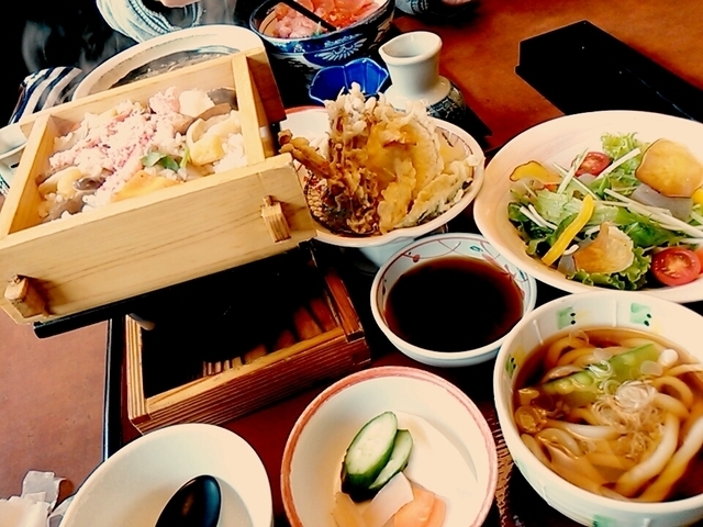 秋のフェアメニューを注文♪ きのこと十穀せいろ膳です。まいたけとえのき、さつまいもの天ぷら、せいろで十穀米ときのこ、栗など入ったせいろごはん、冷・温のそばかうどんが選べてサラダもついてきました!! 秋を満喫できたメニューでした☆