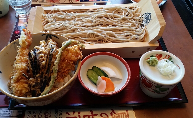 天丼とそばがセットでお得。 天丼はえび、かぼちゃ、いかなど具材が豊富。 そばもおいしくボリューム満点。