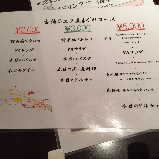 夜のコースも2千円からとお手軽な値段からあるので、安心。お肉やお魚はその日のオススメから選ぶのもいいと思いますし3000円だとパスタと両方いただけるのでお得です。 迷ったら、お店のひとに相談するか、黒板の本日のおすすめからチョイスすると間違いないかも。 まま友とはランチで利用、土日もパスタランチが千円程度なので、気軽に誘えます。 仕事仲間とは、ちょっと飲み感覚で、前菜3品とワンドリンクのセット、二人で1500円。私は鳥レバーペーストがお気に入り。 茨城の食材にこだわり、イタリアンなの?と思わせる意外な組み合わせで食べさせてくれるので、新しい発見もあって毎回行くのが楽しみです。