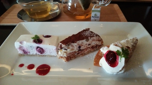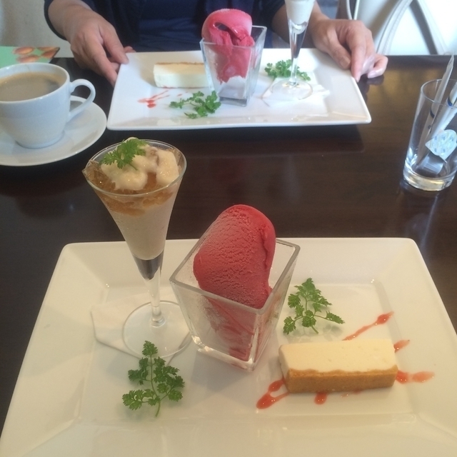 デザート三品、盛り付けもおしゃれで、見た目だけでテンションあがりました。味もとってもおいしかったです。紅茶のカップも大きかったのでたっぷり飲めて、大満足でした。店員さんも、感じよくて居心地もよかった。また行きたいと思うお店でした。