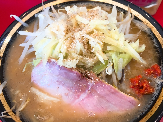 また久しぶりの日曜昼に再訪すると、カウンター席・卓子席ともにほぼ満席と言う盛況さ。後客も次々と入店して来ます。今回は味噌野菜ラーメン(普通盛)を麺かため、味・油普通で注文するとともに、サービスクーポンで叉焼1枚を追加してから、カウンター席隅に着きました。やがて到来した丼にはマイルドで甘め・とろみのある味噌スープが張られ、中太ストレート麺(160g)が浸っています。麺上の具は茹で野菜(もやし・キャベツ・刻みネギ)の小山と味付のしっかりした約5mm厚の豚ロース叉焼2枚(うち1枚はサービス品)のみ。味噌スープはこってりさと味わいがよく、実に美味しい。また、カウンター上の調味料(グリーンニンニク・ガーリックチップ・刻み生姜等)を途中でラーメンに投入して味変させ、その味わいをも愉しみました。