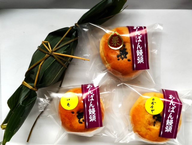 【あんぱん饅頭】 ちょっと小ぶりなあんぱん饅頭。中の餡は、つぶあん、かぼちゃ、栗、おいもの4種類。 やさしい味でおいしかったです。(150円) 『ちまき』も一緒に購入しました。中はこしあんでしたが、甘すぎず、おいしくいただきました。(150円)
