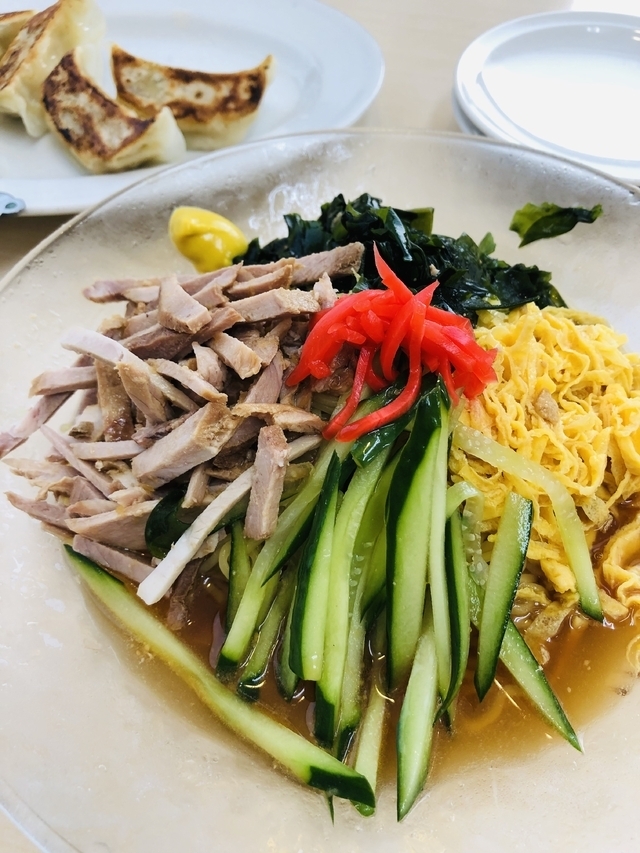 土曜日13:50頃、夫と下の子と約2年ぶりの「やち」です。 お昼ピーク時は過ぎてそうな時間にも関わらず、お店の前は満車で道路の向かいの駐車場に停めました。 私達が着いた直後にも2台入って来て、相変わらずの人気店ですね。 店内は8割ほどのお客さんが入ってます。 店員さんに人数を聞かれ、座敷に着席。 昔からここの炒飯が好きなのですが、この日は朝から冷やし中華気分だったので、予定通り私は冷やし中華と、夫はねぎ味噌ラーメン、サイドは餃子と冷奴(夏季限定)を注文しました。 待つこと7〜8分でまずは餃子、すぐにメインも到着〜。 冷やし中華は具材も麺もスープ(醤油)も、ごくごくノーマルでこれといった特徴はなし。可もなく不可もなく。大盛にしようか迷ったけれど、この味なら普通で正解でした(^_^;)正直、某回転寿司チェーンで食べた冷やし中華¥350の方がよっぽど美味しかったのが少々残念。 次はやっぱり炒飯かな!ご馳走さまでした〜。