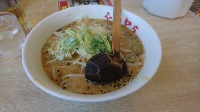 土曜の昼、車で帰省の途中に立ち寄りました。有名店と言うこともあってか、地域の家族らしき人々も含め賑わってます。石下の名店「らーめんすすきの」出身で独立開店してから21年とか。ここオリジナルの黒味噌らーめんにセットメニューの唐揚げ(3個)+半ライスを注文。黒味噌スープのハネを防ぐ紙エプロンとともに到来しました。黒胡麻の浮く黒味噌スープは、モノの本に拠れば竹炭でなくイカ墨で、アンチョビも加わっているとか。ニンニクも入っているはずですが、特に気にならず、甘みのある独特の味わいで実に美味しいです。具はもやし、ニラ、タマネギ、豚挽肉の炒め物が小山になっており、その上にワケギが多く載ってます。バター片も入っていて、スープと混ぜ合わせると味わいが一層深くなります。価格の割に量が多いのも良いです。セットの唐揚げですが、これも熱々の揚げたてで、しかも一個一個がかなりのデカさ。すっかり満腹になりました。