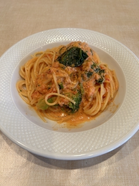 土曜夜に連れと初めて訪れると7割ほどの入りです。お店の人に訊くと、ピッツァは無いけれど夜はコースのみでなく単品メニューもあるとのことで、黒板に書かれた単品メニューを見せてもらいました。シェアの形で「えびと彩り野菜のトマトスパゲッティ」「白身魚とキャベツのスパゲッティ(アーリオ・オーリオ)」「気まぐれサラダ」を注文。初めに到来したサラダは、レタス・ミニトマト・ブロッコリー・パプリカ・オクラ・グリーンアスパラ・サヤエンドウに、最近は見ることが珍しいカリフラワーが混じっています。これらに旨塩ドレをかけたもので、普通に美味しい。メインのトマトパスタは、大きめでプリプリのエビ剥き身のほか、ブロッコリー・カリフラワー・サヤエンドウ・ズッキーニが野菜の具として入っています。アルデンテ仕上げの中細麺にトマトクリームソースが絡んで美味しい。できればタバスコソースが欲しかったところです。アーリオ・オーリオは、白身魚(鯛か?)の細かい切り身のほか、キャベツと小松菜が具材と比較的シンプル。ニンニクとオリーブオイルのソースはあっさりした感じです。これらのみではちょっと物足りないので、ドルチェ(りんごのタルト)とホットコーヒーも追加注文。ドルチェはタルトだけでなくカットオレンジとパイン、ホイップクリーム、それにバニラアイス1玉も添えられています。ドルチェとホットコーヒーでしばし寛ぎました。