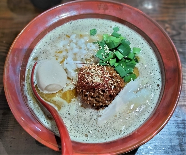 《台湾むじゃきそば+味玉》980円 食券制なので、入店後食券を購入すると席に案内されます。 今回は、台湾むじゃきそばをいただきました。 濃厚なスープは甘辛く味付けをしたひき肉と辣油で少し辛さが加わります。 具材はひき肉の他に、きざみ玉ねぎとニラ、柔らかい鳥チャーシューです。 味玉は+110円でトッピングしました。 麺は中太ストレートでやや堅めの茹で具合です。 とてもおいしくいただきました。