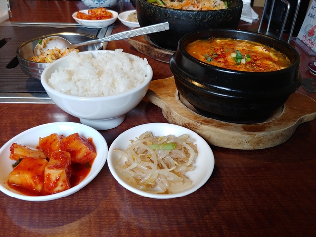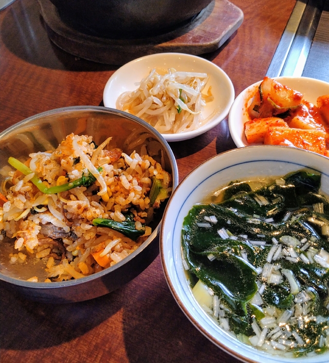 平日のランチに初来店。 ランチメニューの中から石焼きビビンバをチョイス。ウーロン茶?麦茶かな?、カクテキ、もやしナムル、ワカメスープが付いてきました。辛味も強すぎず美味しくいただきました。