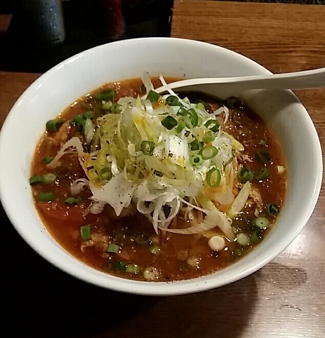 ●鶏三味とまと870円 鶏モモ肉、もね肉が入り、 ボリューム満点。 とまとラーメンより、 濃厚感があり、 鶏肉がたっぷり。