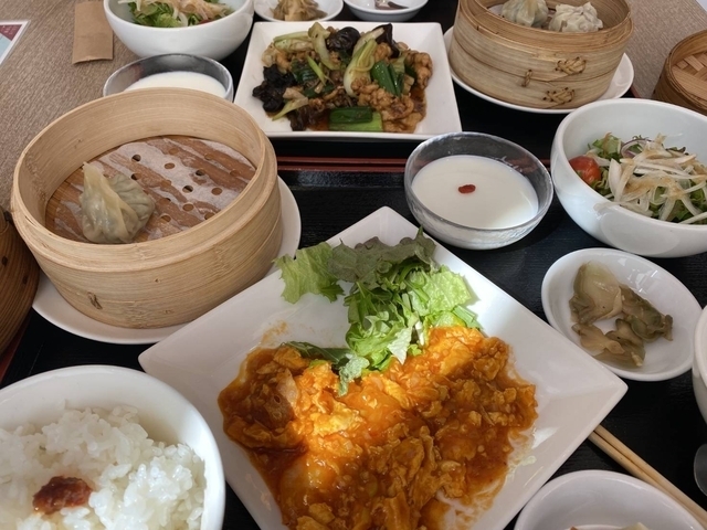 平日限定の週替わりランチA(エビと卵のチリソース炒め)をいただきました。メイン皿はエビと卵のチリソースを炒めですが、これに刻みサニーレタスと水菜が添えられています。点心としては蒸籠蒸しの焼売2個、またサラダ(サニーレタス/水菜/紫タマネギスライス/ニンジン/プチトマト/和風ドレ)、小盛ライス、スープ(かき玉中華スープ、刻みワケギ入り)、ザーサイ、杏仁豆腐(クコの実トッピング)が付きます。エビと玉子…は、まあ甘辛い普通の感じのエビチリですが、点心の焼売には刻み椎茸が結構入っていて、特有の香りと歯触りで美味しいです。杏仁豆腐はさっぱりした甘みが良いです。