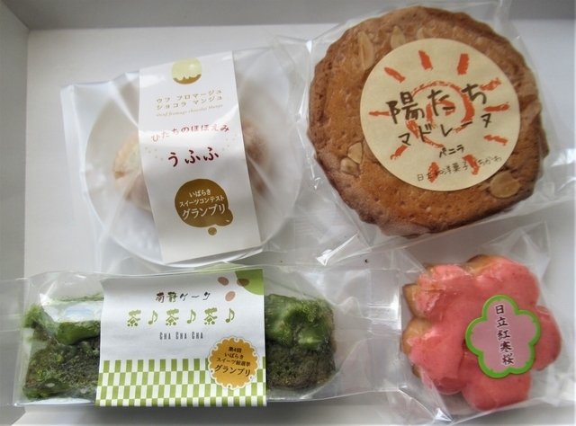 《焼菓子もおいしい!》 フルーツを使ったケーキやどら焼きなどがたくさんありましたが、焼菓子もたくさんあり、今回は4種類の焼菓子を購入しました。 ★南静ケーク…日立市地域ブランド認定品のスティックケーキ。4種類あります。 ★うふふ…スイーツコンテストでグランプリを受賞したお菓子。 ★日立紅寒桜…桜風味のドーナツに桜風味のチョコがかかっています。 ★陽たちマドレーヌ…商品名に「ひたち」が入っていたので購入しました。 マドレーヌはシンプルですが、他の焼菓子は工夫されたお菓子で、おいしくいただきました。 焼菓子もおすすめです。