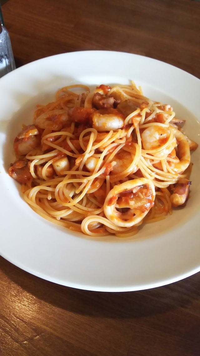久々にグルービーのパスタ食べました。初めてトマトソース系にしました。海の幸にしたら海老やいかなどが沢山入ってました。また食べたいなと思いました(^_^)v