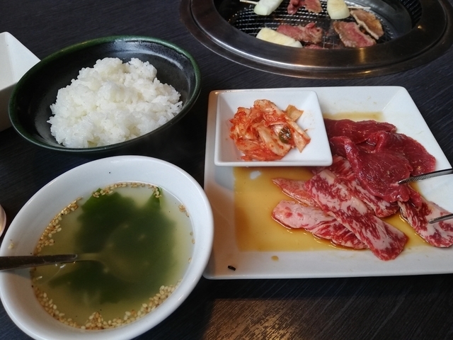 ランパラメニューのカルビ定食を注文。黒毛和牛カルビ6切とタマネギを焼き、サラダ、ワカメスープ、烏龍茶とともに食しました。ご飯は1回お替わりできるようでしたが、お客が多かったせいか入店後もしばらく待たされ、スタッフもてんてこ舞いの慌ただしさでしたので、あまり寛げなかった点が残念。
