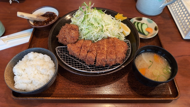 久しぶりに昼に再訪しました。年末ということもあってか、昼忘年会らしき予約グループが何組か入っていてほぼ満席です。ランチメニューに女性専用と思われる「なでしこランチ」というのがあったので、お店の人に訊いてみると男性でもOKとのこと。未食だったのでこれを注文しました。内容は主皿に一口ヒレカツ3切、手こねメンチカツ2切、旬の野菜フライ2個、千切りキャベツ(水菜・紫タマネギを含む)が盛られ、これにカットレモンと和辛子が添えられています。本日の旬の野菜は蓮根で、鶏そぼろのような餡をはさんだ蓮根はさみ揚げ。これにご飯、豚汁に胡瓜・人参の浅漬、さらに選べるドリンク(ウーロン茶/オレンジ/グレープフルーツ/カルピス/コーヒー(ホットorアイス))が付き、ドリンクとしてホットコーヒーを選びました。揚げたてのカツは熱々で美味しく、ご飯とキャベツをお替りして今回も満腹・満足でした。