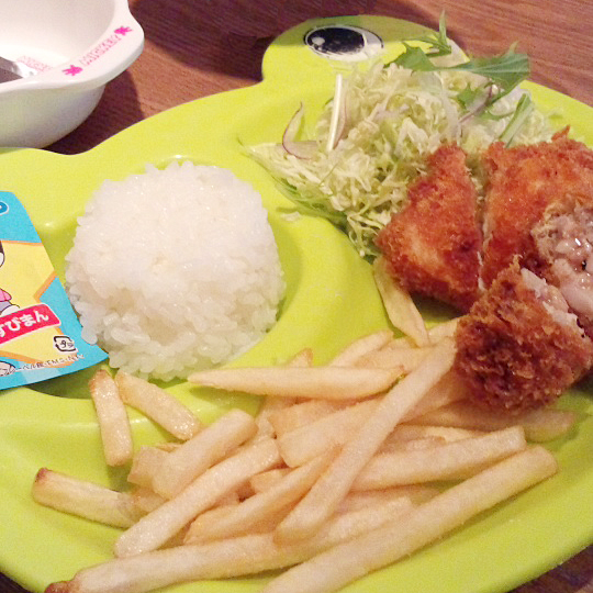 こちらが小学生未満のお子様が無料でいただける お子様プレートランチ。 カツは手こねメンチとチキン。 ポテトがこんなに♪ ドリンクとアイスも付いてきましたよ~。