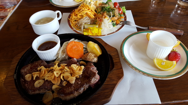 ガッツリとステーキが食べたくて久々に行ってきました。シャリアピンステーキ450g、写真のガーリックステーキ300gをミニセットで頂きました‼相変わらず、ステーキソースは抜群です(^-^)v サラダも、以前と変わらない品揃えで、ドレッシングも数種類あって良かったです。店員さんの印象も良くなっていてgood \(^o^)/