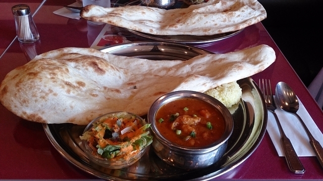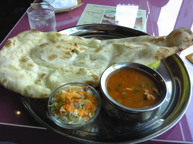 ランチメニューにあるチーズナンセットを注文。径20cmくらいの丸いチーズナンに、それぞれ小ぶりの器に入ったバターチキンカレーとサラダのセットでした。チーズナンの中にはたっぷりの量のチーズが入っており、バターチキンカレーは甘めのもののため食べやすいですが、しばらく食べると少々飽きが。やはりチーズ相手には、辛めのカレーが選べるといいと思った次第。