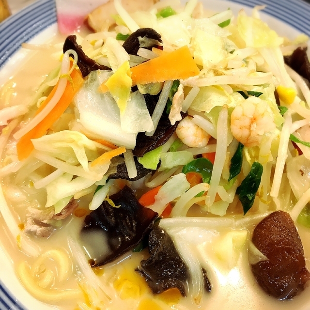 久しぶりに昼に訪れて「きくらげたっぷり塩ちゃんぽん」を食しました。ただ木耳は言うほどたっぷりでもなかったですが、希少な国産ものを使用しているからでしょうか。他の具材は刻み豚バラ肉、紅白カマボコ、さつま揚げ、小エビに多めの野菜(キャベツ、もやし、ニンジン、カイワレ、タマネギ、ネギ)、さらにすり胡麻が散らしてあり、やはり野菜補給にはありがたいです。