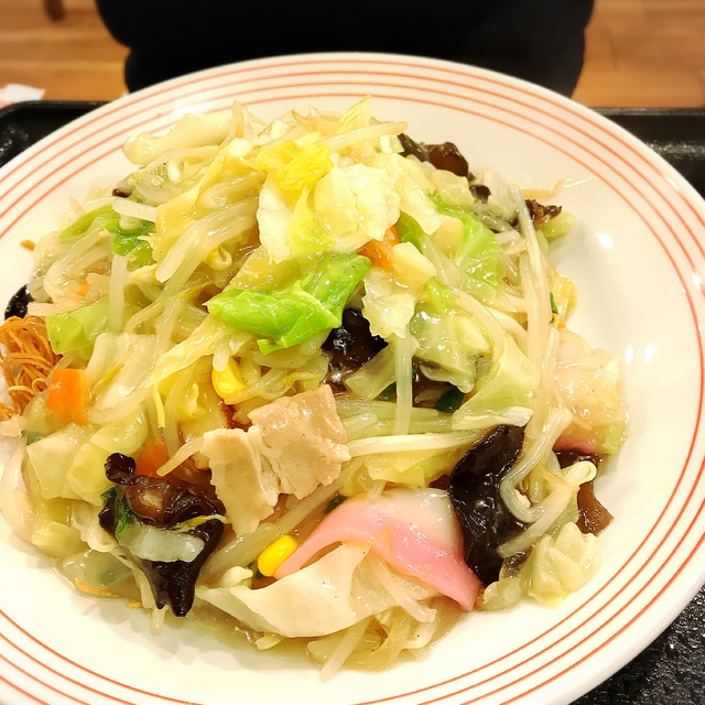 また久しぶりに昼に訪れ、店舗・期間限定のあんかけちゃんぽんを食しました。野菜321g(うち、もやし300g)とのことで、相変わらず野菜不足時には良いです。餡かけの具は多量のもやしの他、国産キクラゲ、ニンジン、ネギ、コーンに薩摩揚げ、豚バラ肉、小海老、カマボコで、これを熱々の餡で閉じています。白湯はほんのり生姜の味わいもあり、熱々の餡は寒い時には良いですが、期間限定だけに夏前で終了するのかな?