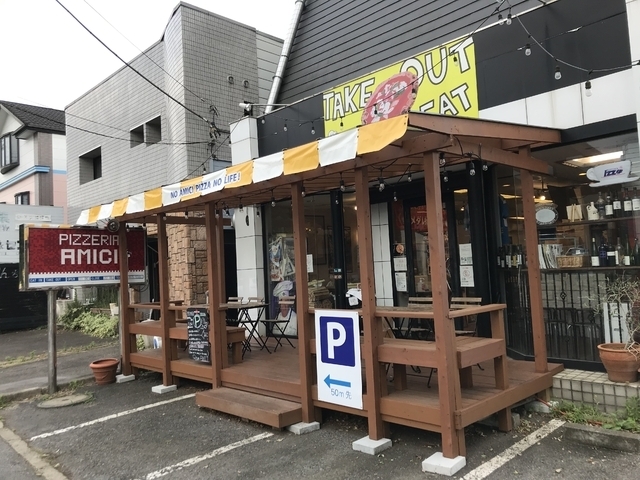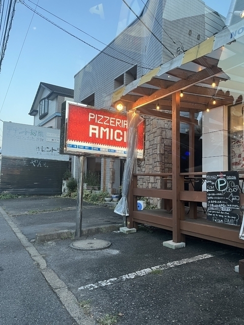 食事ができるアミーチのすぐそばでお持ち帰りメインのアミーチ 人気のマルゲリータをお持ち帰りしました。生地が薄くてとても おいしかったです。パン生地が好みの人は違うかもしれませんが、 窯で焼いてもらえるので温かです。1枚で2人くらいですが、 調子がよければ1枚くらい食べられます。 ジュースも頼んだ枚数に応じていただけます。おいしかったです。