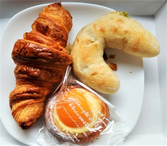 人気のブーランジェリーで、早い時間の訪問が必須です。 午後訪問しましたが、中央のテーブルには商品がほとんどなく、窓側のみに商品が並べて ありました。 購入したパンは3種類。 『クロワッサン』190円…大きくても生地が何層にも重なって食べ応えありました。 『オリーブ』160円…オリーブの実が3つ入ったパンで、モチモチしておいしかったです。 『アプリコット』200円…カスタードクリームの中にもアプリコットが入っています。 どのパンもおいしくいただきました。