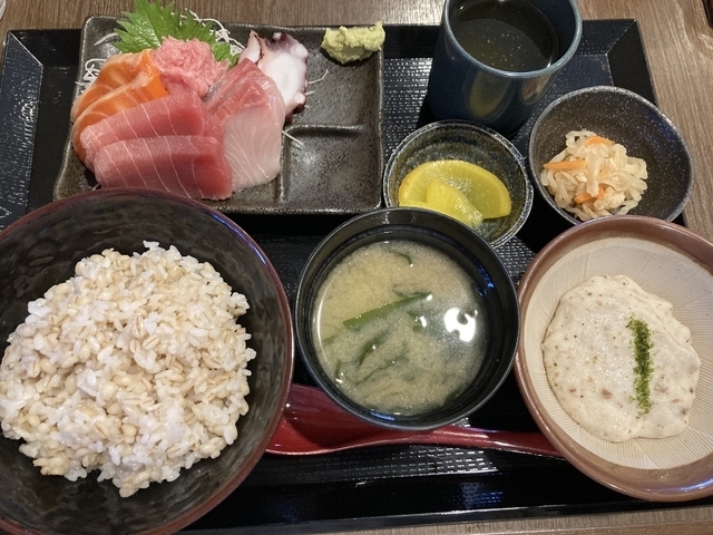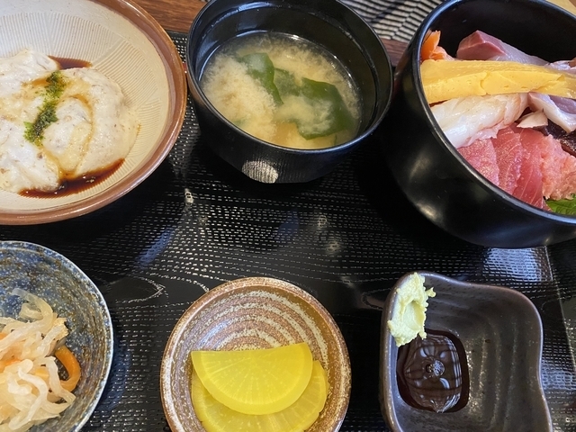 日曜日も昼時は混むことが多いです。 海鮮丼御膳をいただきました。刺身が大きく色々たっぷりと乗っていました!自然薯は自然薯たれで美味しくいただきました。