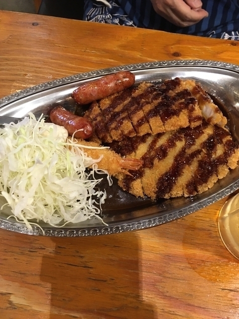 今夏ランチで伺い、金沢カレーがなかなか良かったので、日曜昼に連れと再訪しました。夏カレーはやはり人気があるためか、卓子はほぼ満席という盛況。今回は気になっていた、全部のせカレーをライス200g(小)で注文しました(連れはエビフライカレー(ライス300g(中))。到来したステンレス皿に盛られたカレーは、やはりドロッとして黒く濃厚、千切りキャベツも目に馴染みました。カレーの上には、約15cm長・8cm幅のチキンカツに同程度サイズのロース豚カツ、タルタルソースがけのエビフライ1本、それにウィンナーソーセージ2本が載り、ボリュームMAX状態です。やはりそこそこ辛いながらも甘みがあって美味しく、今回は満腹かつ満足しました。