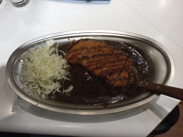 猛暑下ではやはりカレーで元気をつけようと、平日昼、久しぶりにこちらを再訪しました。今回は未食の「エビフライカレー(中・ライス300g)」を注文。黒カレー上に、約10cm長のエビフライ2本が載り、タルタルソースがかけられています。サクッとした衣にプリッとしたエビ肉が美味い。相変わらず黒くドロッとした濃厚なルウはあまり辛くないですが、旨み・コクがあって、これも美味しいです。付合せは千切りキャベツのみ。卓子上に備え付けのの福神漬(赤色)もたっぷり添え、今回もあっという間に完食でした。