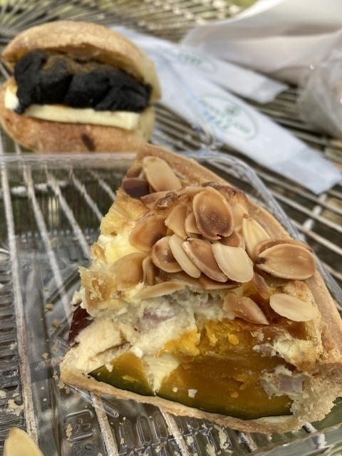 平日の昼間でもたくさんのお客さんが入っていました。季節限定のカボチャとさつまいものキッシュは食べ応え抜群!黒ゴマあんバターチャバタも厚切りバターが丸ごと入っていて豪快!