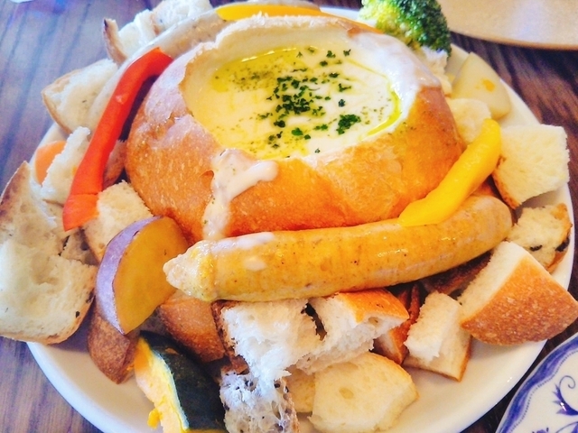 チーズフォンデュ♪♪ フランスパンの中にチーズが入っていて周りにはパンやにんじんやさつまいも・ソーセージなどたくさんありました♪ 最後までおいしく食べれました☆