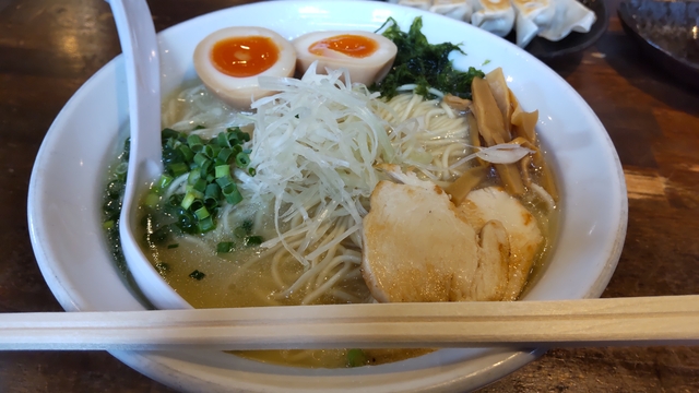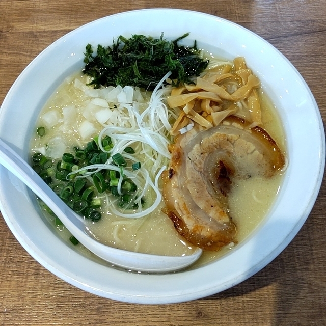 平日の昼間11時過ぎに3人で伺いました。店内は、テーブル席4卓、カウンターが約10席ぐらいで、既に4、5組先客がいました。 食券制で、濃厚鶏白湯塩ラーメン、大盛、味玉にしました。店員さんから、チャーシューの鶏か豚かを聞かれて鶏を選択。 濃厚の名のとおり、スープはクリーミーなほどで鶏の出汁が利きつつ、なぜかエビのような風味も 感じられ、ギトギトではない濃厚さで、おいしいです。 ただ、大盛にしたせいか麺がスープを吸ってしまうのか麺がもっさりヌカヌカした感じになってしまい、食べ終えた時にはスープもほぼ無くなっている状態でバランスが悪いと感じました。なので、濃厚を食べる時には普通盛りにしてライスをつける方が良さそうです。 具は白髪ネギ、青ネギ、タマネギ、海苔、メンマチャーシュー、味玉(100円)で、鶏チャーシューは胸肉のしっかりとしたチャーシューです。 このご時世にこの価格でこのボリュームはコスパがよく大変ありがたく、スープはおいしいのでスープと麺のバランスがもっとうまく噛み合えば、自分好みなラーメンになり満足感満点だと思いました。