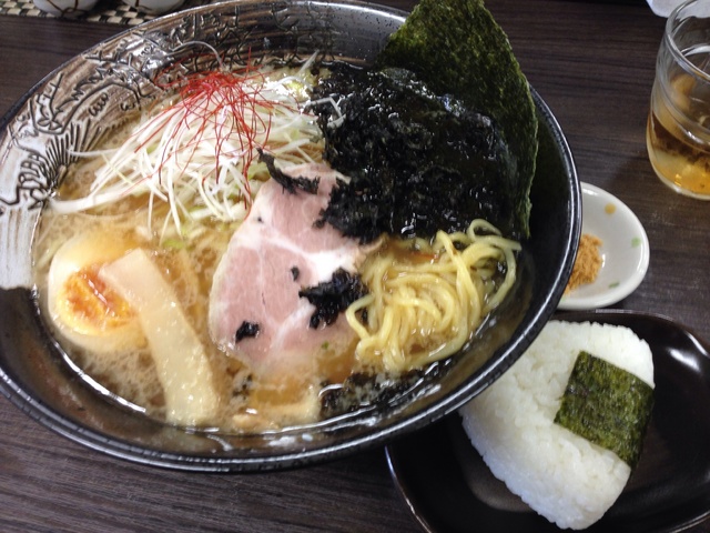 関西の製麺所製という麺は多加水の細縮れ。茹で具合はやや柔らかめだがこれぐらいの方がうまい。豚ガラで出しを取ったスープに強めのカエシを合わせ、背脂を浮かべてあるが、このカエシが円やかで旨味が強い、海苔、岩海苔、低温チャーシュー、半味玉と、具が充実している上におにぎりが付くなど800円でもお得感がある。