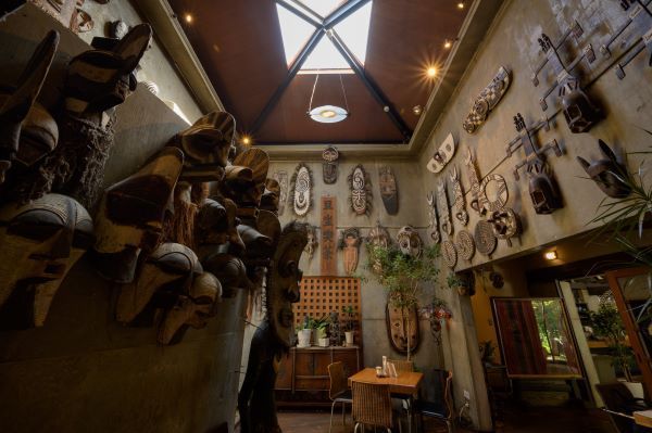 アフリカやパプアニューギニアの仮面や、パナマ・グァテマラの民芸品など、コーヒーの産地の文化に出会える