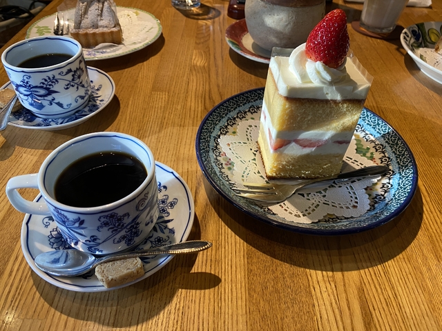 復活版のショートケーキとクリスマスブレンド赤をいただきました。 縦長のケーキで食べ方悩みましたが美味しかったです。 周りも頼んでいる人いっぱいいました。