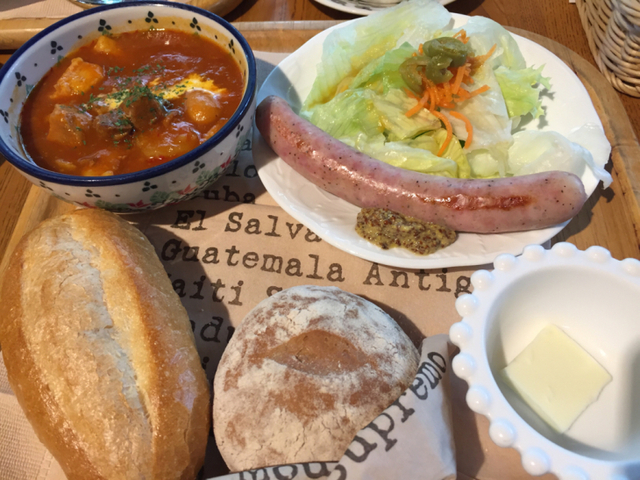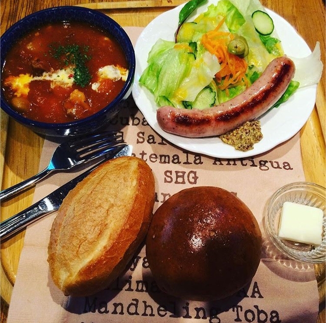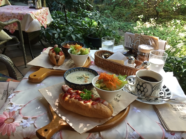 素敵な庭を眺めながら休日のブランチ。自家製パンにソーセージ、具沢山のポークのスープに大満足です。 ブレンドコーヒーは、苦味や酸味のバランスがよく、とても美味しかったです。
